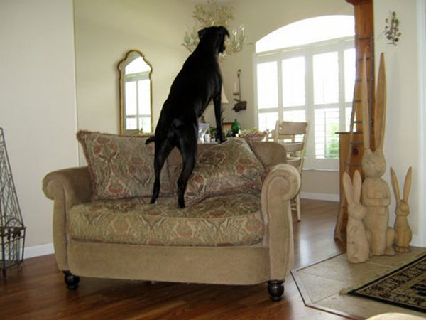 aww, look at that lab standing up, as if about to jump off the back of the sofa! he/she is almost bigger than it is!