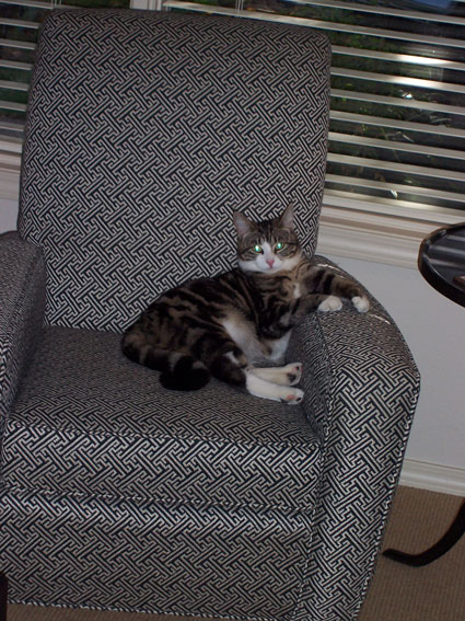 Sweet Pea was an abandoned stray kitten found in downtown Boise, Idaho in an alley behind a bar.  She was sick and starved, but as you can see, she has fully recovered and is living the good life and loves to hang out in my favorite chair.  I love black and white in my cats and my furniture.