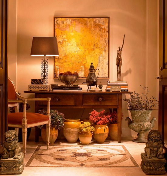 Love this look, I love mixing contemporary with rustic pieces and finer antiques. And that entry way with the yellow provencal jars would go perfect in my house. I have an entry that I have yet to do anything with and cannot seem to find the right size table.