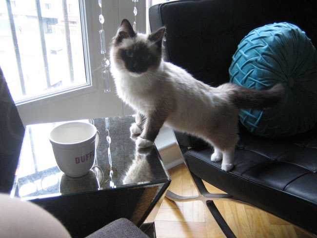 “Meet Lola, my 4 month old Ragdoll kitten. When she’s not following me from room to room like a second shadow, she likes to jump up from my Barcelona chair onto this mirrored table to get a really good look outside.”