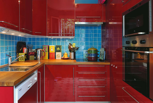 I would have never in a million years thought that turquoise and red, would have matched up with the decadence of the kitchen with the turquoise tile.