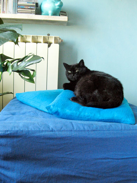 “This is Stefy on her favorite pouff. I’ve found her five years ago, very sick, sad and with her three small kittens. Now she’s very healthy and happy, and so are her babies…i have kept them with me all three of them. I have a total number of eight cats, all rescued from terrible situations. My house is small but extremely fun!!”