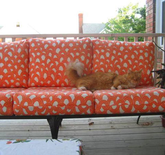 “Pumpkin resting on my newly upholstered outdoor sofa. He looks great in orange!”