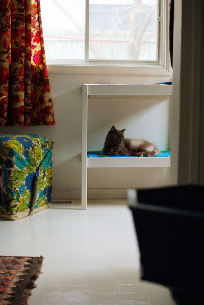 We’ve got Milo on my old dining table, Phoebe on an African camping chair a friend gave me, a plethora of cats scattered about my office, and Edgar asleep on the Ikea-hacked baby changetable.