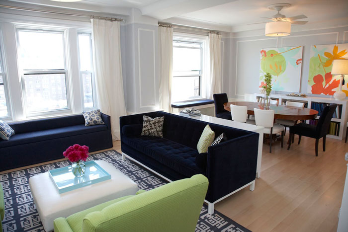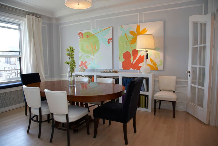 Suze Yalof Schwartz of the blog Dwellers Without Decorators had emailed us a while back looking for curtain inspiration. She emailed again to share with us her fabulous newly renovated New York apartment and OMG did I ever have to share it with you all. It’s gorgeous and I love every square inch of it. Her home is very Jonathan Adler-esque (she even met him and told him so!). Here are some photos of her living room which she turned into a combined living/dining space (so she could use the dining room as an office/den). The architecture of this apartment is phenomenal and must have been so exciting to work with. (Decent existing architecture is so hard to find). I am smitten with the wall colour, the trim detail she added to the walls, her Jonathan Adler sofa, her dining chairs…