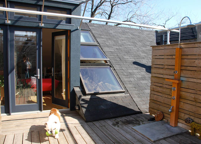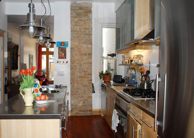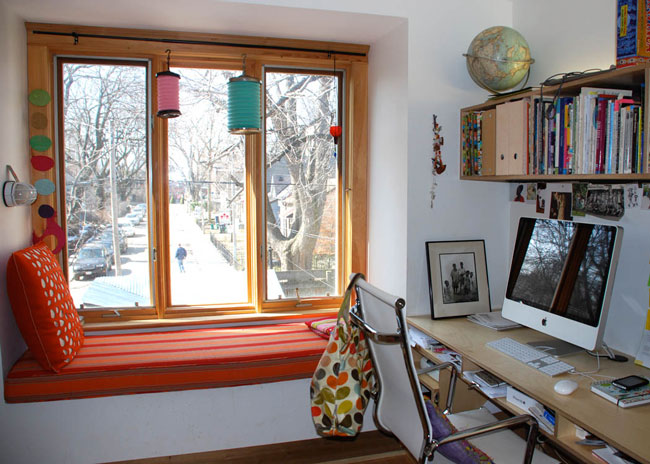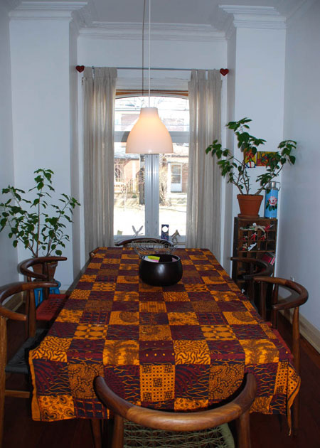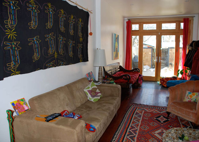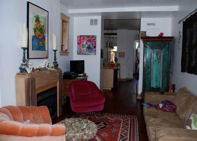 The other day Carolyn emailed with some adorable photos of her English bulldog for the next pet post (stay tuned Monday!), and also sent along some photos of her Victorian home in Leslieville, Toronto. Her house has great bones – some exposed brick, cool angled windows, loft, rooftop deck and her eclectic style brings to it all little bit ‘o funk. Thanks for sharing with us Carolyn! (P.S. Although there’s nothing wrong with Carolyn’s photos, I was shocked to hear she’s friends with photographer Virginia MacDonald and hasn’t had Virginia photograph it for her!)