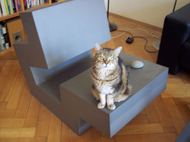 “This is our cat Kitsch on the steel chair in our living room, by a German designer named Roger Knöhr. Kitsch is trying to upstage the chair, sitting pretty and making eye contact with the lens, like the movie star she thinks she is. This time the chair wins. How could it not?”