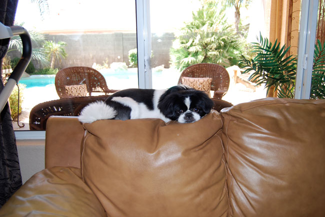 “This is my three year old Pekingese Manny showing off his summer haircut. You can find him pretty much anywhere in the house when he wants to lounge, but he really seems to like the sofas where he can keep an eye on everyone 🙂”