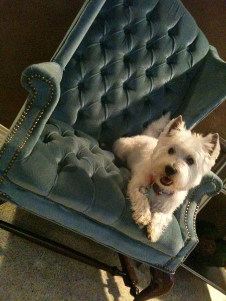 “This is a pic of our adorable fur baby; Cooper. He grown fond of our blue wingback. I wonder if he’ll still like it when I reupholster with a houndstooth print…”