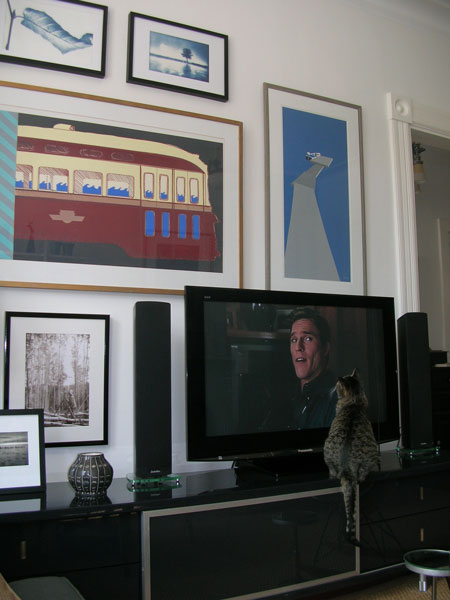 “Here is a picture of my cat, Mary, watching tv in our living room. I think it was Law & Order (she used to like it, but lately she has stopped watching it). The art on the wall, listed in order clockwise from the top left includes: two cyanotype photographs by my husband Marek Warunkiewicz, “Float” by Charles Pachter, a small photo by Bill Schwab (sitting on the furniture), a photo taken around 1910 of my great grandfather who was a surveyor in Western Canada, and one of the famous Toronto streetcar prints by Charles Pachter. The vase was made by my husband.”