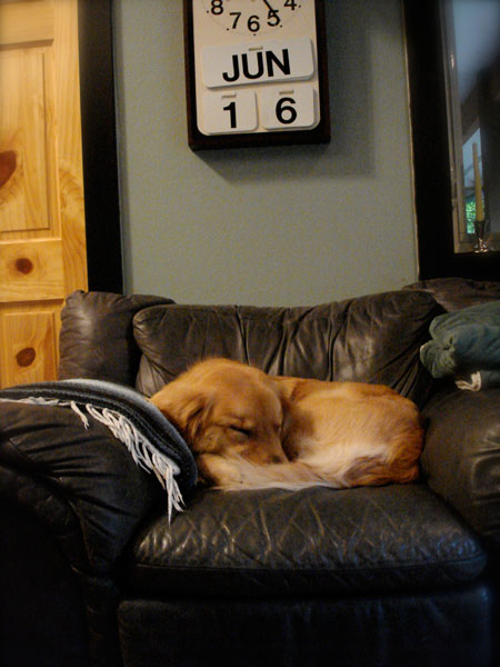 “This is my golden retriever, Murphy, relaxing on one of the many chairs and couches that came with the house we kindly purchased for him to enjoy. The clock I found at a thrift store.”