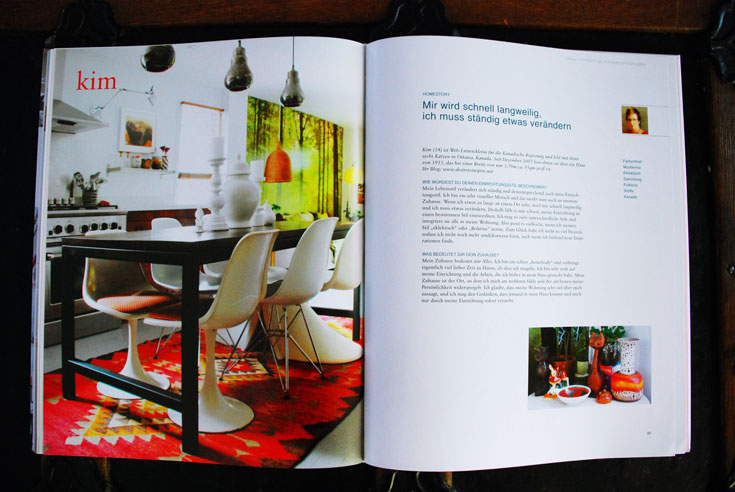 Quite some time ago I was approached by the folks of the website ucinteriors.com (their German counterpart is solebich.de) if I wanted to be a part of a book they were having published on some of the homes whose photos were submitted to their community. The main idea of the book is to show real homes of real people. They kindly sent me a copy and it arrived just now. I was so excited to see my kitchen on the cover, my living room on one of the cover pages, and then SEVEN whole pages of my home! I am so honoured to be included among so many other quirky and lovely homes and I cannot wait to devour the rest of the book (which I unfortunately cannot read a word but I’m all about photos anyhow 🙂 ). A huge thanks to Claire and Luise!