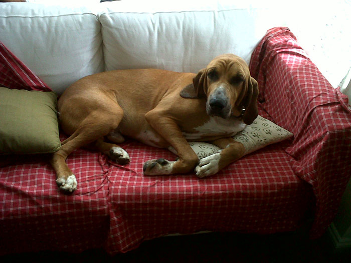 “Our bloodhound Rufus, bleary eyed and caught by surprise on the couch”