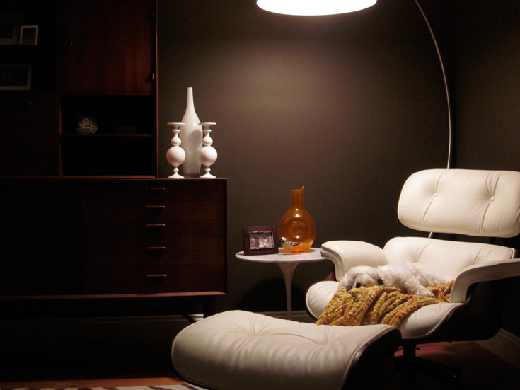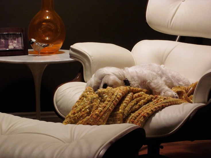 “This is my dog Chip 🙂 He basically lounges wherever he feels like it, and lately he’s taken a liking to our white eames lounger… He slept through the whole thing!”
