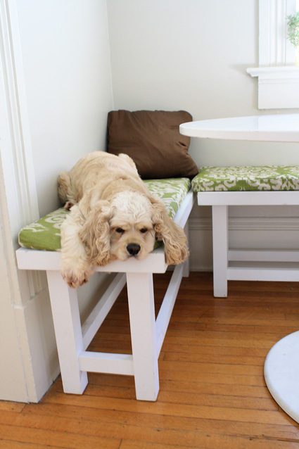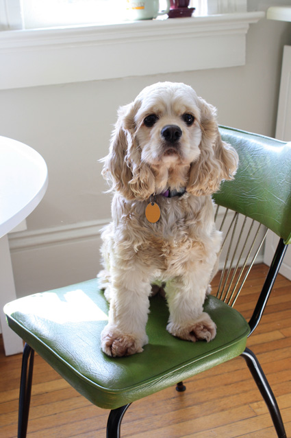 “This is Lula, my nearly-two-year-old cocker spaniel. She alternates sitting in my green $8 flea market chair and lying on the custom benches – just as long as she’s near the kitchen table and whatever food happens to be on it.”