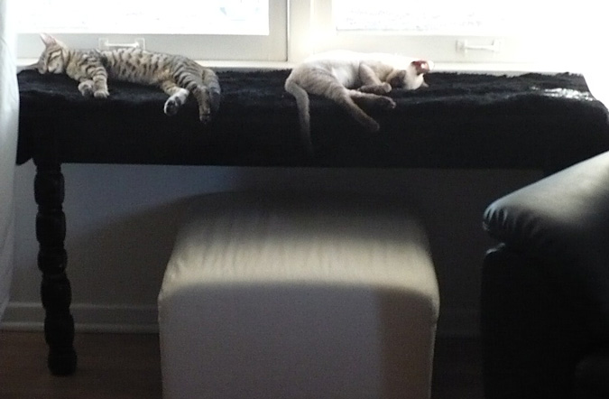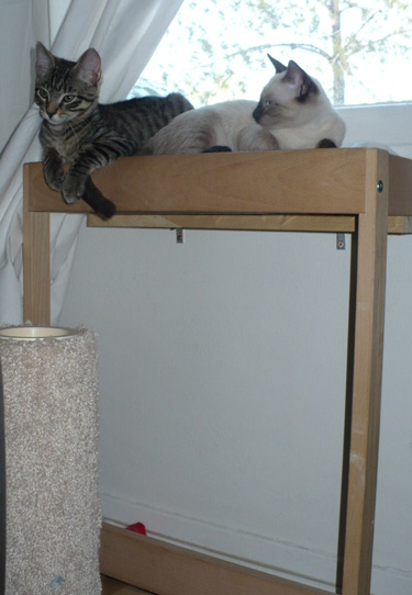 Photo 3: Kirin and Ome on a cat perch made out of an old coffee table cut in half. We used all four legs to match the window height.”