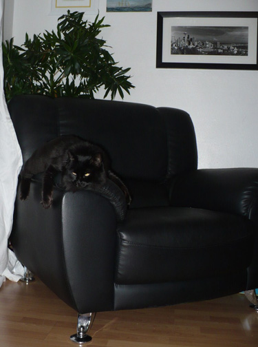 “Photo 1: Our older cat Camille (she’s 14) performing her chair hatching pose.