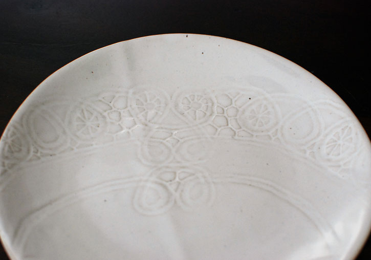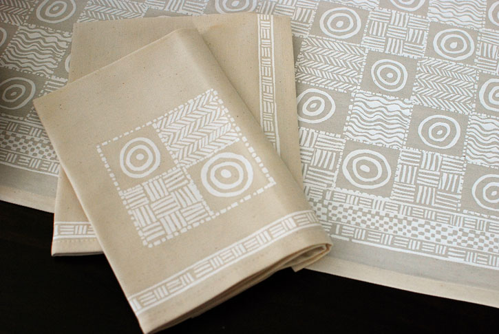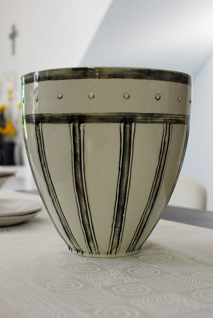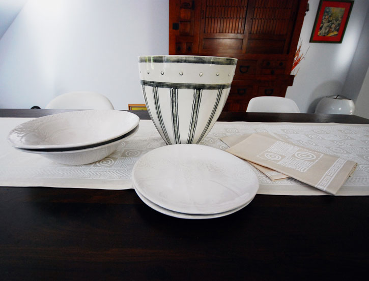 Here is what I came home with: a stunning hand-painted table runner and napkins created by Carole Nevin from South Africa, a large black and white tulip vase (9″ tall with an opening of 9″), 2 of the most gorgeous and perfectly sized pasta bowls (I think I need more) and 2 side plates from the same artisan (Di Marshall of Wonki Ware, also based in South Africa).