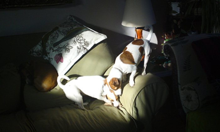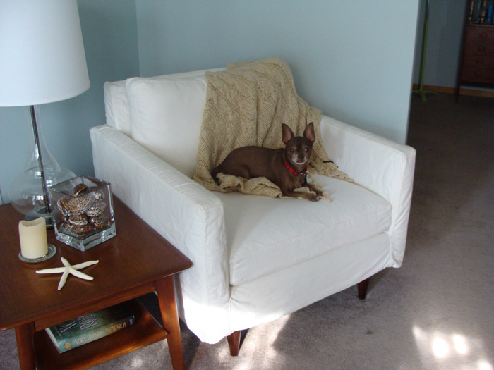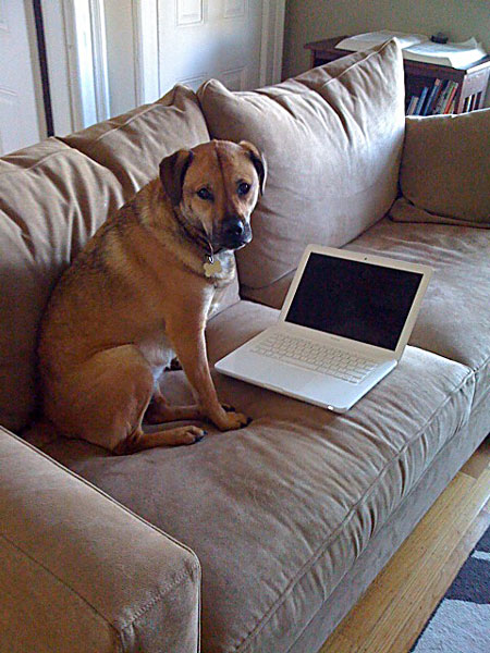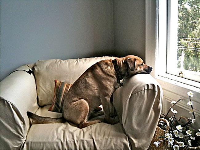 “Hi, this is Sasha, my 3-year-old shepherd mix. I adopted her seven months ago, and she just recently discovered this new perch, in what I now call her Watching Chair (old cheap club chair, Pottery Barn slip cover), where she monitors the goings-on outside my window. In the second photo she is on my new Room & Board sofa contemplating my laptop, which she wishes I would move, as this sofa has quickly become her favorite. spot. ever.”
