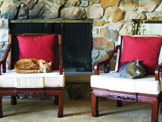 “Here are our two cats, Marlowe and Cassius, taking up the most regal seats in the house: two carved Chinese rosewood chairs. I’ve included a close up with Cassius on one of the chairs, ready to receive his humble subjects 🙂”