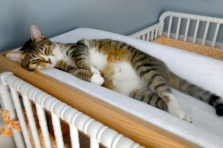 “Our furbaby, Charlie, waiting to have his diaper changed – guess he got fed up with the kitty litter…”