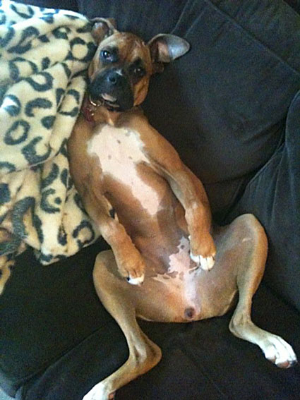 “Here’s a photo of our little boxer, Lucy from Seattle. She is not on a beautiful piece of furniture….but furniture non-the-less! 🙂”