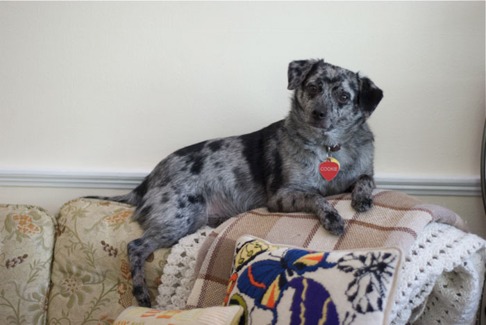 “This is our four-year-old Shih-Tzu, Ellie, who rules at our house. Here she is enjoying our custom-designed charcoal velvet sofa. After adjusting her blanket to her liking, she struck a pose saying (undoubtedly with attitude) ‘This is my sofa–I dare you to tell me otherwise!‘”