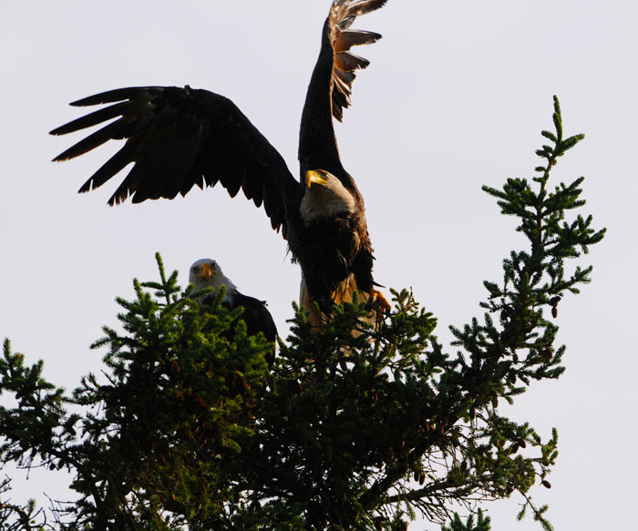 Unfortunately today there will be no Flickr finds post. My husband and I are on a sort of mini-honeymoon in Prince Edward Island, visiting his family and friends (Jeff grew up there). I didn’t have time to get a post ready before we left so I thought I’d just slap up a couple photos from our trip so far (I’m hoping to get my regular posts up throughout the week so you folks won’t even miss me.) We arrived late Friday night after a 14 hour drive, and will be heading home next Saturday. We love it here – it is SO peaceful and relaxing. We’re staying at my inlaws’ cottage on Covehead Bay and it really is a little slice of heaven. We are hoping to make this trip a yearly summer ritual. Below will show you a glimpse of why we love P.E.I. – the first is the cottage, the second is the view from the window of the bedroom, the third was taken at our trip to a beach (Blooming Point) yesterday and the last 2 of bald eagles were taken by Jeff and his mother using his father’s INSANE 600mm lens. They land daily on the top of the trees along the water line. (I have this set on Flickr for photos of this trip which I’m be uploading to as often as I can).
