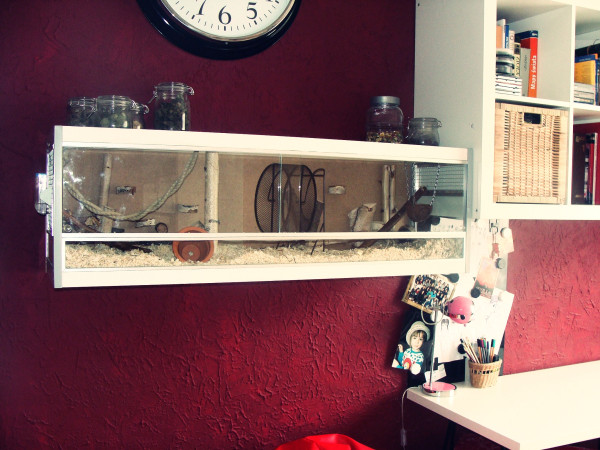 Our second reader’s room today is from Monika who shares her home with her pets… just not your usual pets. I’ll let her explain. “It’s a pretty hard job to make the house/room where you have lots of animals look good. Of course I’m not talking about dogs breeders but about rodents. Lots of cages and stuff everywhere. I am a happy gerbils breeder, there are about 30 gerbils, just in 12m2 and I hate when house is a mess because of it. That’s why I decided to build some cages for my rodents using IKEA and a little bit of imagination.” Monika I think it’s brilliant! I want to come back in my next life as one of your gerbils. This is such a clever idea for kids’ rooms. Rodents, insects, snakes, lizards. See – things that make you go eeeeekkk can be stylish too!