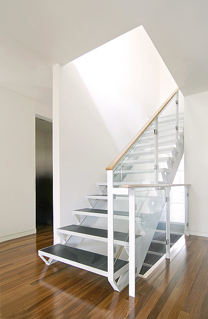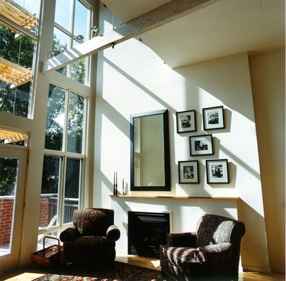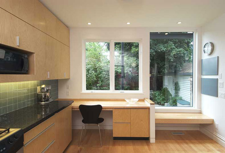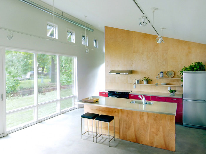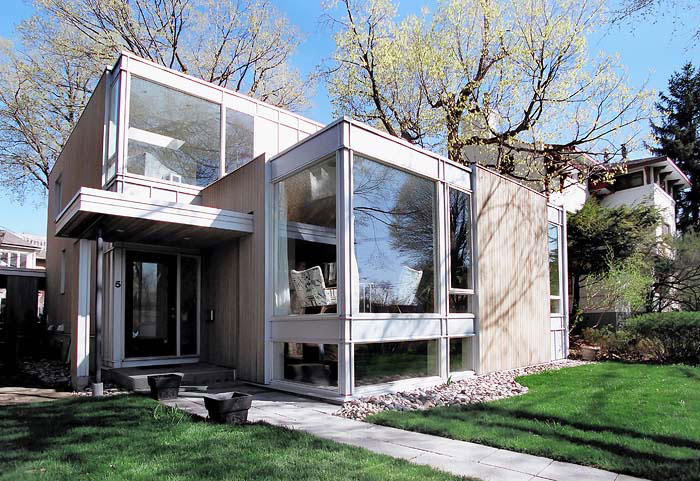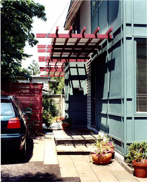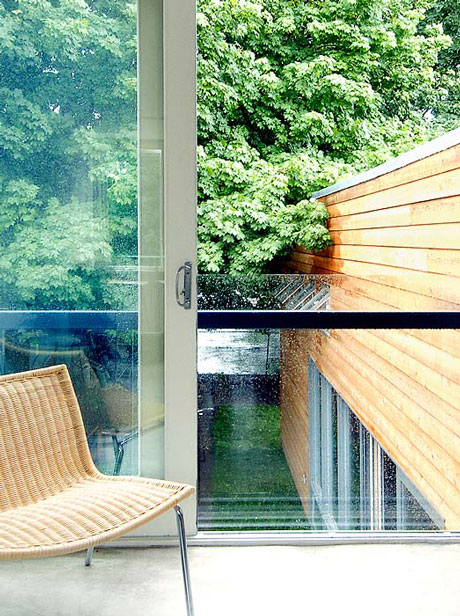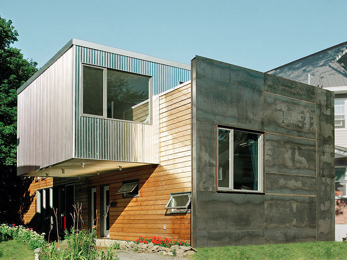 As I’ve mentionned a couple of times, my husband and I have been doing a bit of research looking for architects to help us plan the additions we want to make to our WAY too small and WAY too boring home. Our cat-sitter used to live on a street a few blocks from us where there was one of the coolest yet simplest homes I’ve ever seen around Ottawa. We recently saw the home in Ottawa Magazine and found out it was designed by local architect John Donkin. It’s 1700 square feet and his client had 3 requirements: a garden, a visitors’ apartment, and a strong street presence. The visitors’ apartment is cantilevered sideways over the lot which creates a shaded area in summer and a covered parking spot and sheltered entrance in winter. The mix of materials on the facade is exactly what I’m looking for and the kicker is the front of the home (iron?) has rusted over time and turned the most beautiful deep orange shade (second photo found on the blog Move That Bus!!!).