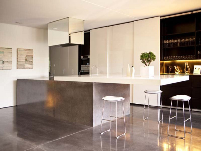 wow i just love the concrete flooring on the kitchen floor going all the way up to be the island.