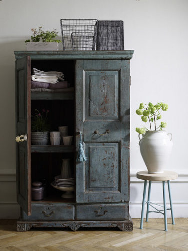 I'm drawn to the all-white living room with the huge window and pendant light fixture which reminds me of a dandelion (white and fluffy), the window shelf with the blooms in their humble jars and the beaten-up old cupboard (I can picture it in my imaginary unfitted kitchen).