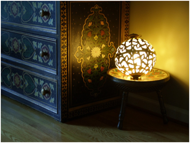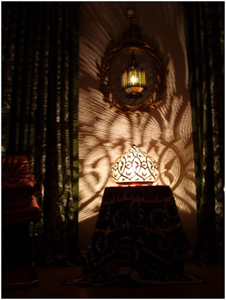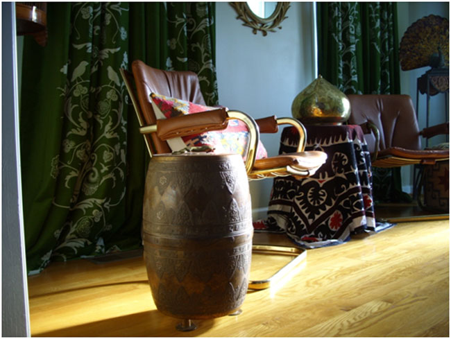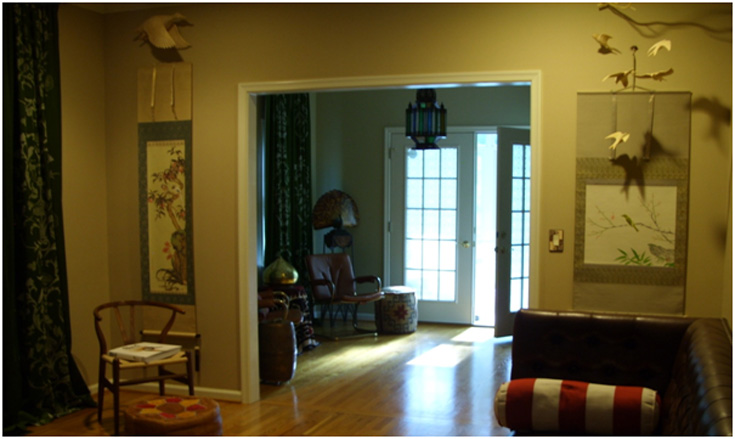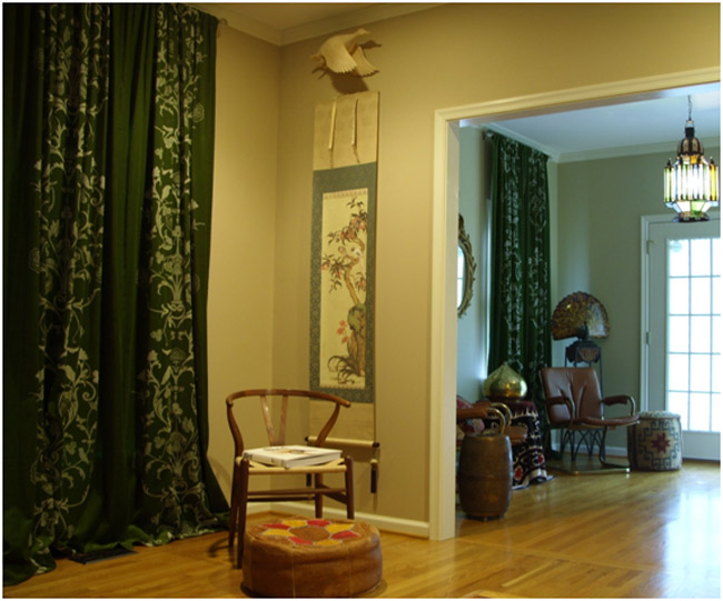 Here’s an email I received the other day from Sandra: “You featured my dining room on your blog before (HERE) & I’ve slowly been working on the rest of my home. I’m sending pics of my den which I’ve been putting together in dribs & drabs w/some really good bargains via consignment shops & ebay. I really enjoyed seeing other readers’ homes & thought to send this in.” And am I ever glad she did. Her den is a cozy mix of many styles but is a wonderful cohesive space with lots of global influences. I love it Sandra!