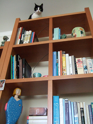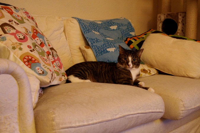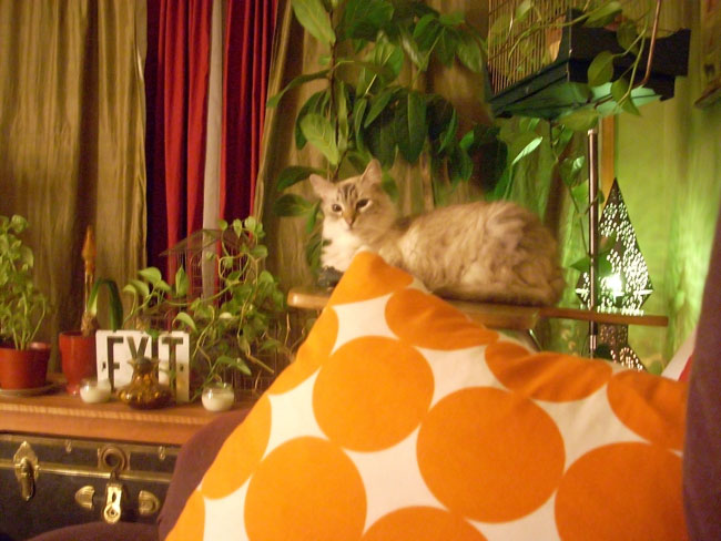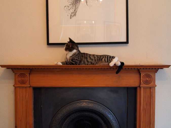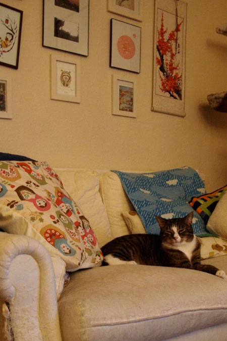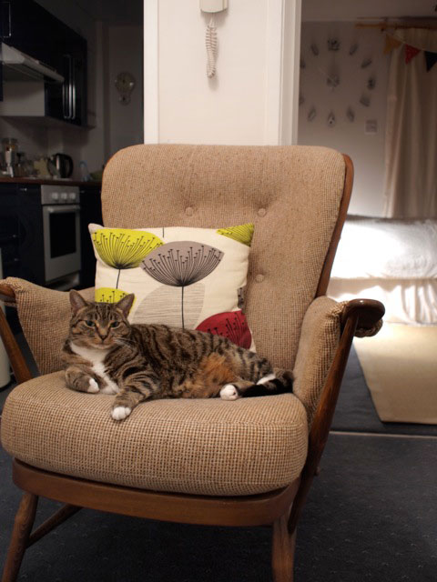 “Here’s my year-old kitty Yoni on ‘his’ sofa – you can see ‘his’ tree in the background, and his attempts to destroy the sofa (a hand-me-down from my parents) on the left. I made the cushions myself and the wool cloud rug (which he loves) is by Donna Wilson. Also a bonus photo of when he was smaller and used to hang out on the fireplace mantel.”