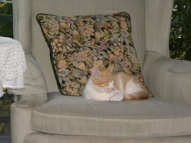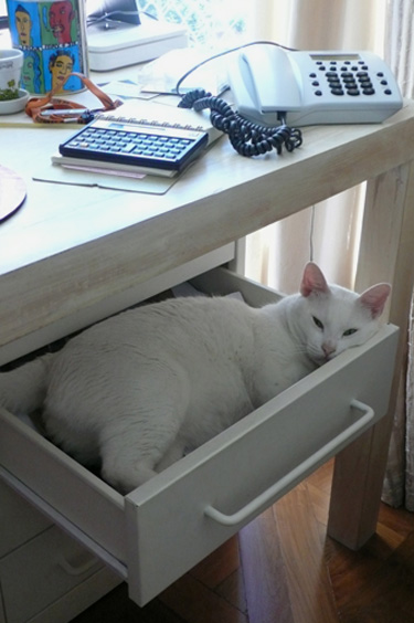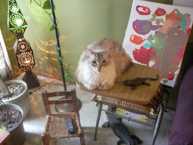 “I bought a school desk to replace my London Tier phone book table. It just didn’t “tie the room together” This is Yap-Yap, my Maine Coon/Siamese mix in her new napping place. So much for a phone sitting there.”