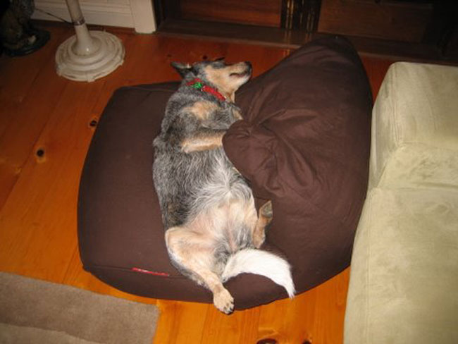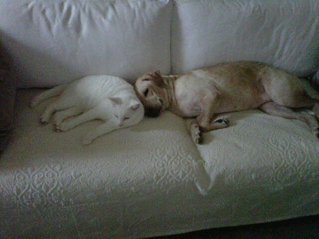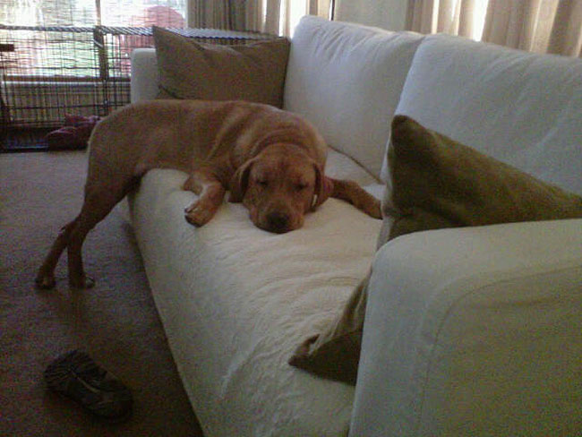 “First photo is Bodhi, on one of two Ikea sofa’s in the living room. He sleeps like this often. The other photo is Oliver the cat and Bodhi’s sister, Brinkley, later in the day on the same sofa. I, of course, was on the other sofa, so they had to share. You’ve featured Brinkley before, sprawled out on the coffee table.”