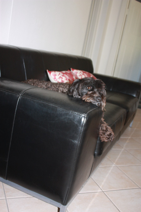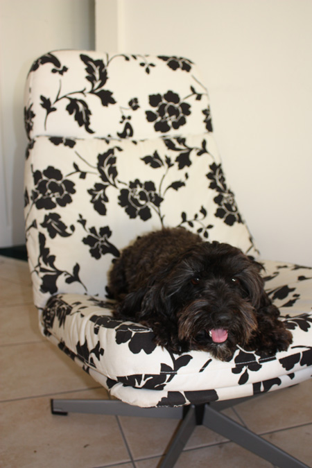 “This is our Spoodle Maggie chilling out on our Ikea floral chair and leather lounge. She really doesn’t have that much to be sad about (it’s all for the camera).”
