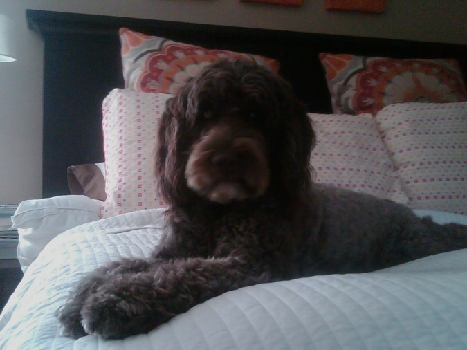 “This is Gus, our 3 year old Portuguese Water Dog, loves to lay on our bed. He feels like a king when I let him on the bed. I only do this when my husband is out of town! He is the best pet ever -so sweet and lovable.”