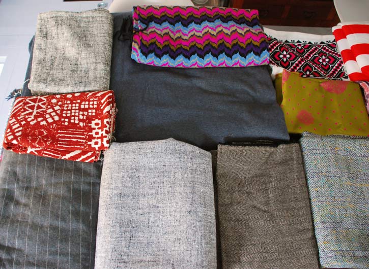And as I mentionned in my intro, below are photos of the results of the fabric flea market. I went with my twin sister Julia and the first 3 photo shows everything we both came home with. The last photo shows my finds (I have these photos on Flickr – check details like sizes and prices there).