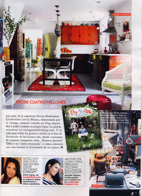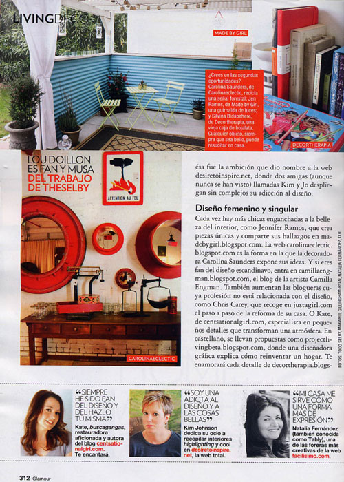 The lovely Leticia of Vintage + Chic blog kindly emailed me this morning about a post she published this morning of a story in the November issue of Spain’s Glamour magazine. She emailed me because the story is about the magazine’s favourite decor blogs, and both our blogs are included! There are photos of the bloggers (icky photo of me seen on the bottom of the 3rd page), and they covered half of the fourth page with a photo of my kitchen!! WOHOO! Congrats Leticia and the other bloggers mentionned!