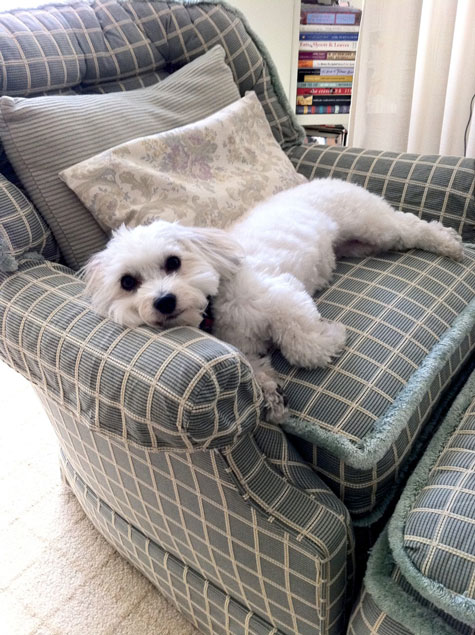 2. My shih tzu, Molly, resting in her favorite spot on our sofa.