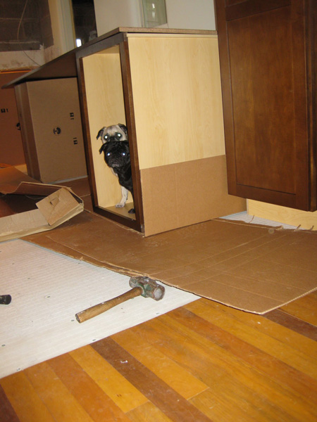 “I love this series, so attached is a photo of my two pugs Leroy & George “helping” us install our new kitchen cabinets in our concrete block 1950s home. They’ve been great so far, always right under foot in case we need a break from holding up the cabinets to pet a pug.”