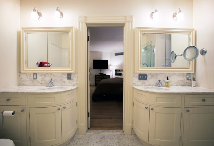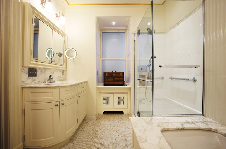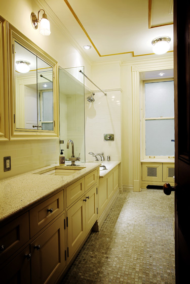 This project consists of the renovation of a four thousand square feet duplex in the Osborne Apartments, a New York City landmark located at 57th Street and 7th Avenue. The work includes combining two rooms to create a large kitchen, renovating all bathrooms and bedrooms. Sustainable “green” materials are used in several areas: cork for the kitchen floor, and IceStone counter tops (a green material made of recycled glass). New, properly counterweighted, double hung wood windows glazed with insulating, laminated glass will improve the performance of the exterior wall by controlling heat loss, heat gain and noise transmission. Our approach carefully knits the new with the old by using traditional materials installed with traditional methods and finishes specific to this particular building (an iridescent floor tile in the bathrooms for example).