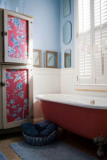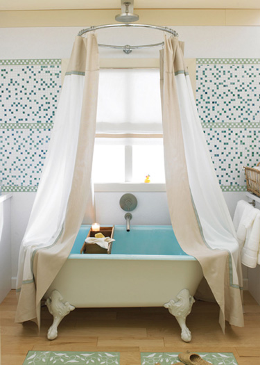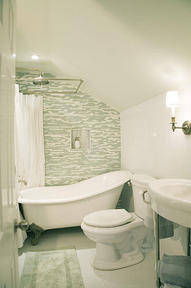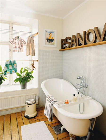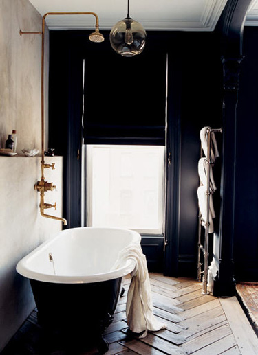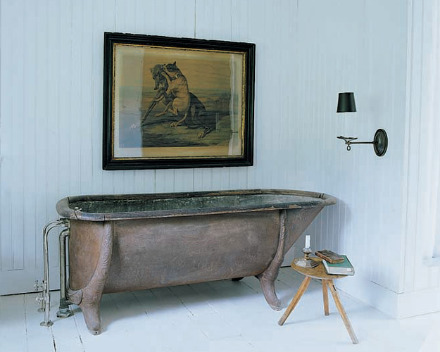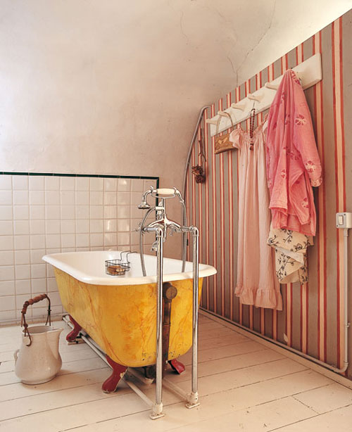 Time for this week’s reader request: “My name is Gisela Diaz and I’m a Spanish girl living in Portugal. Recently I bought a antique bathtub. I been looking for that for more than ten years, and finally I got it. I would like to ask you for some inspiration to restore it and to install it.” I went through my stash of bathroom photos and found some featuring antique bathtubs – mainly clawfoot – to show Gisela the placement/colours/taps and whatever else she may need to figure out. I am completely jealous. I have wanted a clawfoot tub for a long time. Actually, I’d settle for any tub that is large enough to take a bath in (and have adequate water coverage). Last time I took a bath I was probably 8 years old. In all the homes I have rented/bought I have never had a decent tub. I think it’s about time I get one….