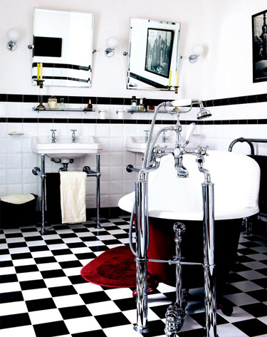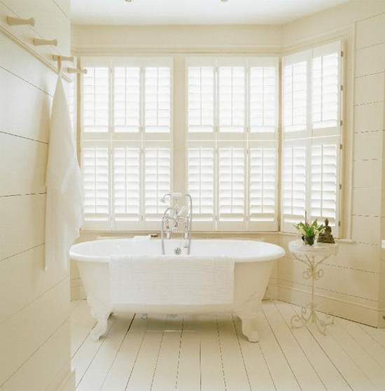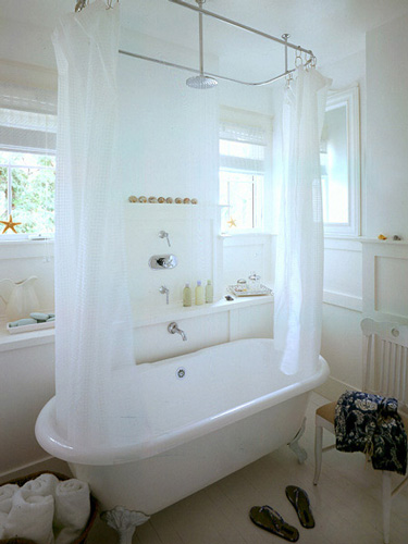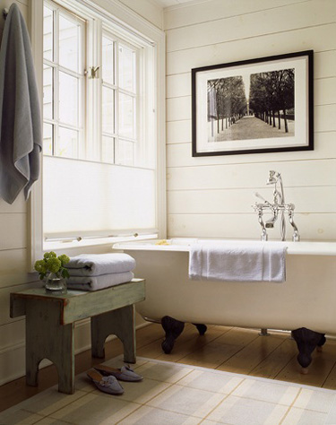 We've just bought a house with a clawfoot bath, but it drives me crazy that the people who put it in have it sticking out diagonally into the room. I so want to change it, but have to wait until we have $$$ for that project- too much else to do. These photos are great- totally inspire me. They had also painted a CREAM and black checkerboard pattern on the wooden floors- but seeing those white floors makes me know EXACTLY what I want to do with that!