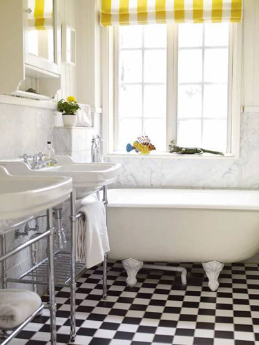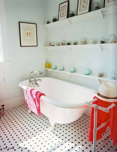 pink and green tubs are adorable. And a black and white tiled floor is my ultimate dream.