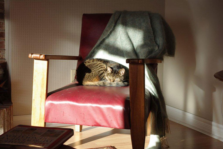 “This is Max, our oldest cat sleeping in the sun on an old chair (one of a pair) that my husband rescued from the trash. All I did was strip the layers of brown paint off the arms and legs. The pleather is awesome–way easier to clean off the cat hair!”