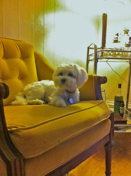 “Love the Monday post for Pets on Furniture and wanted to submit a photo of our little Louie – and a cool vintage chair, too! We call this Mad Men Louie, inspired by the retro velvet chair and stocked bar cart. I think she takes after her moms in her need for a drink after a long day of…. well, sleeping in her case!”