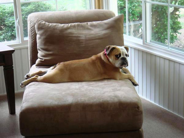 “My English Bulldog Vixen, is obsessed with squirrels. When she isn’t sleeping, she’s usually perched here planning her next attack on the squirrels in the back yard.”