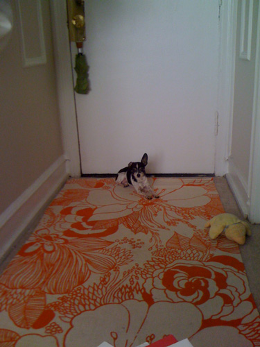 Poochi Payne hanging out on my carpet. He NEVER sits on the floor if there’s a layer. If there’s no rug or layer, he’ll stand with a “no thanks I’ll pass” look.”